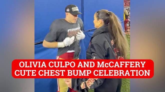 Olivia Culpo cute chest bump with Christian McCaffery like she is a 49ers player
